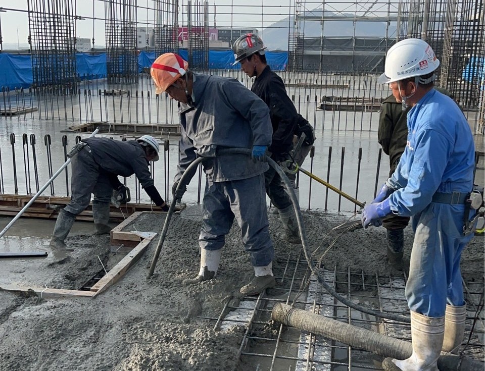 足場の組立作業においては、コンプライアンスを遵守。フルハーネスを着用した安全な作業です。躯体に大きな悪影響を及ぼすジャンカなどの打設不良。コンクリート打設では、そんな打ち継ぎ面不良のない健全な躯体構築を目指しています。 -